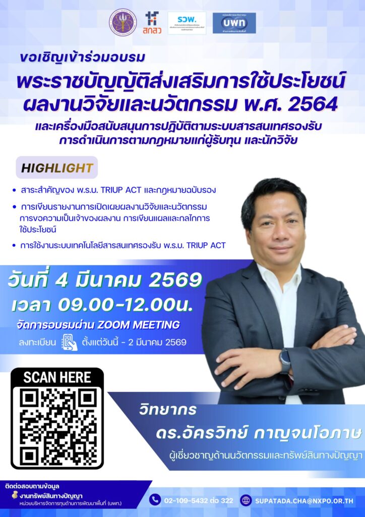 วิทยากรโดย ดร.อัครวิทย์ กาญจนโอภาษ l ผู้เชี่ยวชาญด้านนวัตกรรมและทรัพย์สินทางปัญญา ในวันพุธที่ 4 มีนาคม 2569 เวลา 09.00-12.00 น. จัดอบรมฯ ผ่านระบบออนไลน์ Zoom Meeting