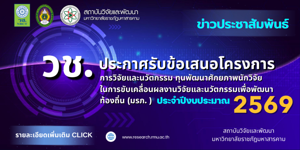 วช. มีความมุ่งหวังที่จะส่งเสริมและพัฒนาศักยภาพอาจารย์มหาวิทยาลัยราชภัฏที่เคยได้รับการสนับสนุนทุนอุดหนุนการวิจัยและนวัตกรรมจากการฝึกอบรมเชิงปฏิบัติการหลักสูตรการเขียนข้อเสนอโครงการวิจัยและนวัตกรรม ของ วช. (ทุนพัฒนานักวิจัยตามกรอบความร่วมมือของเครือข่ายวิจัยในระบบ ววน. (มรภ.)) โดยการสร้างขวัญกำลังใจและแรงบันดาลใจทางวิชาการสำหรับนักวิจัยรุ่นใหม่ที่อยู่ระหว่างการสร้างสมประสบการณ์และพัฒนาตนเองให้ก้าวสู่การเป็นนักวิจัยอาชีพที่มีศักยภาพและคุณภาพสูง และให้คงอยู่ในเส้นทางอาชีพในระบบวิจัยและนวัตกรรมของประเทศอย่างต่อเนื่อง ตลอดจนการสนับสนุนให้เกิดผลงานวิจัยและนวัตกรรมที่สามารถนำไปใช้ประโยชน์ได้จริงในพื้นที่และกลุ่มเป้าหมาย ดังนั้น วช. โดย กลุ่มขับเคลื่อนนโยบายโดยการวิจัย (ขก.) จึงขอประกาศรับข้อเสนอโครงการวิจัยและนวัตกรรม ทุนพัฒนาศักยภาพนักวิจัยในการขับเคลื่อนผลงานวิจัยและนวัตกรรมเพื่อการพัฒนาท้องถิ่น (มรภ.) ประจำปีงบประมาณ พ.ศ. 2569 รายละเอียดปรากฏตามกรอบการสนับสนุนทุนอุดหนุนการวิจัยและนวัตกรรมฯ (รายละเอียดดังไฟล์ที่แนบ)