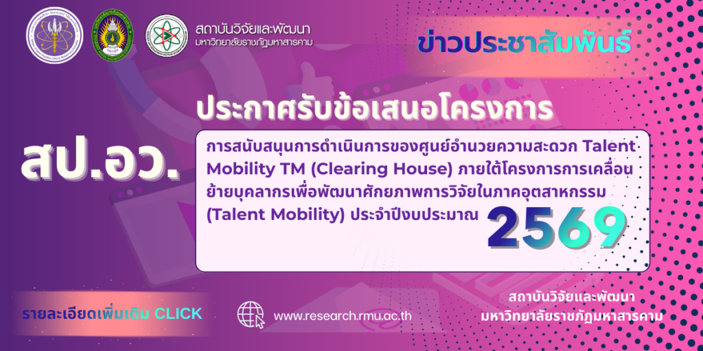 สำนักงานปลัดกระทรวงการอุดมศึกษา วิทยาศาสตร์ วิจัยและนวัตกรรม (สป.อว.)  ประกาศรับข้อเสนอการสนับสนุนการดำเนินการของศูนย์อำนวยความสะดวก Talent Mobility TM (Clearing House) ภายใต้โครงการการเคลื่อนย้ายบุคลากรเพื่อพัฒนาศักยภาพการวิจัยในภาคอุตสาหกรรม (Talent Mobility) ประจำปีงบประมาณ พ.ศ. 2569