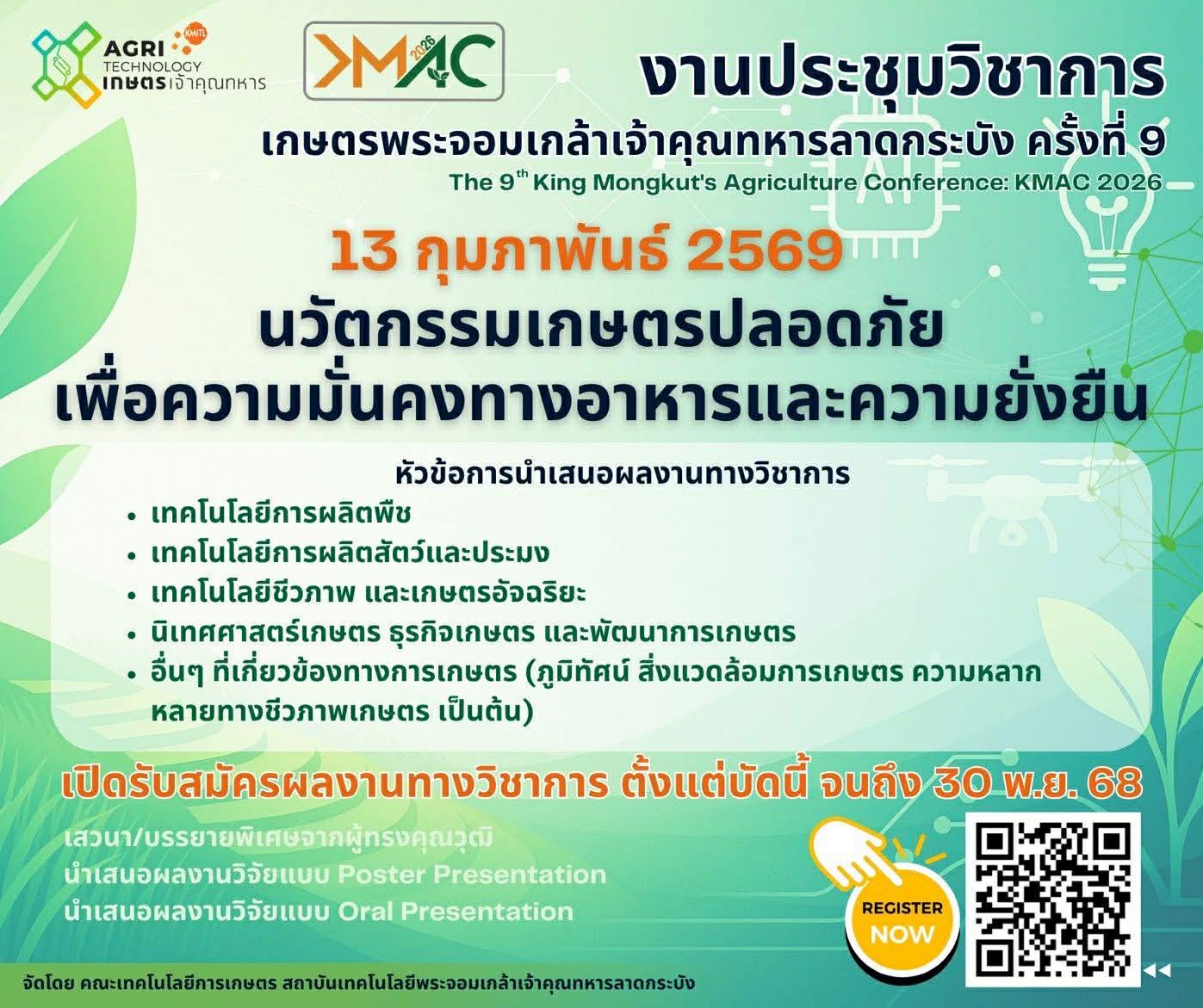 หัวข้อการนำเสนอครอบคลุมหลากหลายสาขาทางการเกษตร เปิดรับสมัครบทความ **ตั้งแต่วันนี้เป็นต้นไป – 30 พฤศจิกายน 68** อัตราค่าลงทะเบียนนักเรียน นิสิต นักศึกษา 900 บ.บุคคลทั่วไป 1,500 บ. ณ อาคารเจ้าคุณทหาร คณะเทคโนโลยีการเกษตร สจล.สอบถามเพิ่มเติม โทร. 087-322-4445 จัดโดย คณะเทคโนโลยีการเกษตร สถาบันเทคโนโลยีพระจอมเกล้าเจ้าคุณทหารลาดกระบัง
